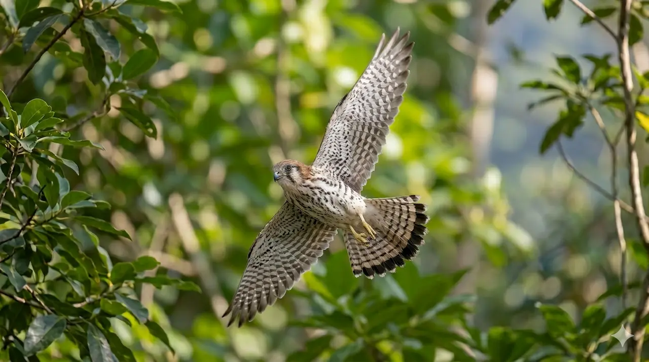 The Mauritius Kestrel hunts by means of short, swift flights through forests.