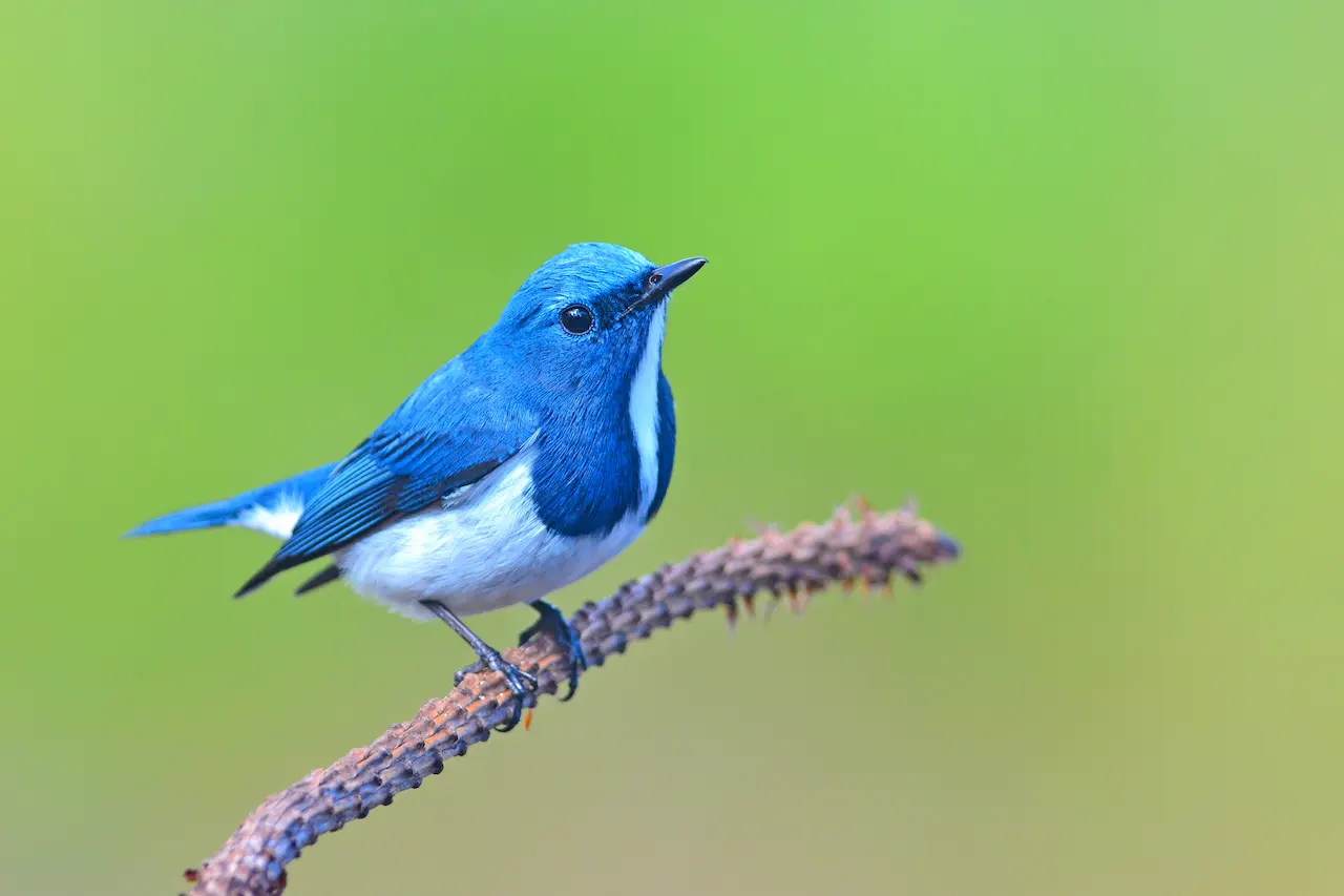 The Ultramarine Flycatcher is also called the White-browed Blue Flycatcher. It is a vibrant and small migratory bird that originates from the Indian Subcontinent. The Ultramarine Flycatcher breeds in temperate forests at the foothills of the Himalayas and migrates south to India for the winter. This species, which is only 10 cm long, is smaller than a sparrow. However, it stands out for its vibrant colouration and energetic behaviour. The male bird is especially striking, with its deep blue plumage on the head, neck and upperparts. This is contrasted with a white patch that runs from the throat down to the belly. For more information, see our guide on flycatchers.